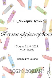 Свечани пријем првака биће одржан у среду, 31.08.2022., у 17 часова у дворишту наше школе.